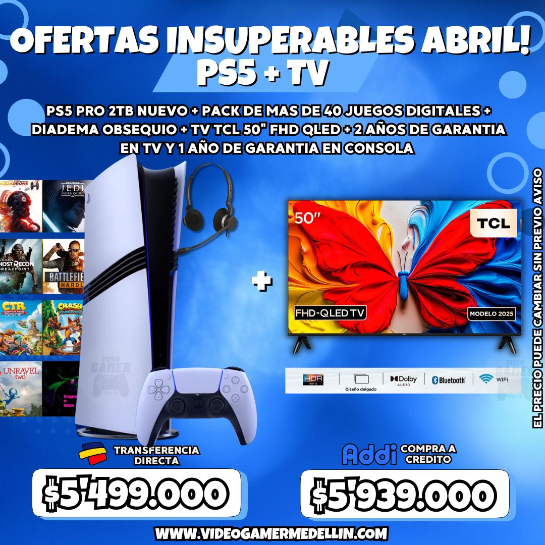 Disfruta de una experiencia de entretenimiento de alto rendimiento con el combo PS5 Pro nueva junto a un TV TCL de 50 pulgadas QLED Smart TV con Google TV, ideal para jugar con mayor potencia gráfica y disfrutar contenido en una pantalla amplia desde el primer momento. La consola incluye un pack de 40 juegos digitales predeterminados, instalados en cuenta primaria o secundaria según disponibilidad, además de diadema para una experiencia de audio más inmersiva durante el juego.