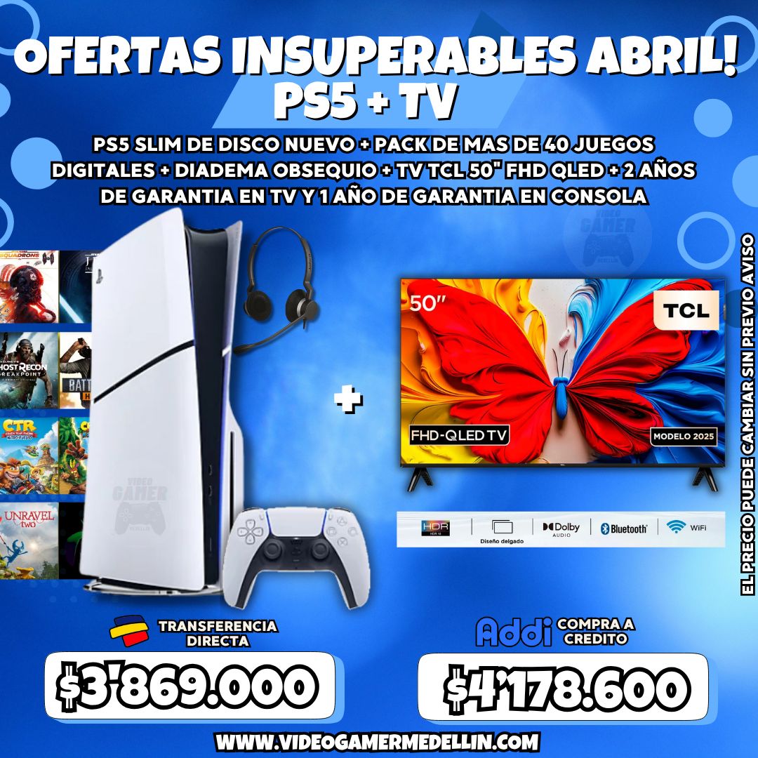 Disfruta de una experiencia de nueva generación con el combo PS5 Slim con lector de disco de 1Tb nueva junto a un TV TCL de 50 pulgadas QLED Smart TV con Google TV, ideal para jugar, ver películas y acceder a plataformas de streaming desde el primer momento. La consola incluye un pack de 40 juegos digitales predeterminados, instalados en cuenta primaria o secundaria según disponibilidad, además de diadema para una experiencia de audio más inmersiva durante el juego.