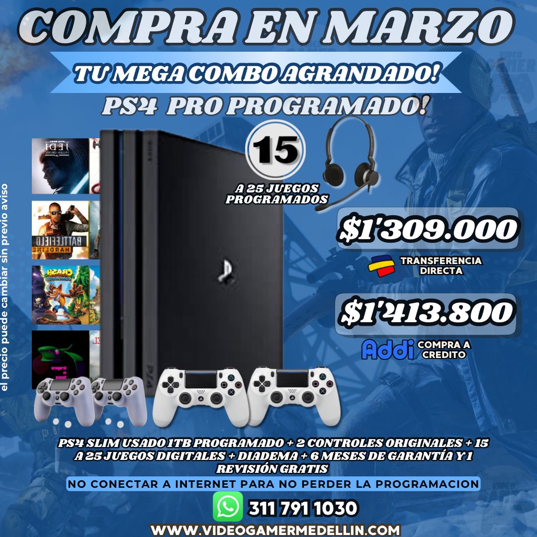 La PS4 Pro programada es ideal para quienes buscan potencia y variedad de juegos desde el primer día. Incluye 2 controles originales usados en buen estado, una diadema de obsequio y una programación con 15 a 22 juegos instalados, listos para jugar. Cuenta con 6 meses de garantía en la consola, 2 meses en los controles y una revisión gratuita durante el tiempo de garantía para mayor respaldo.