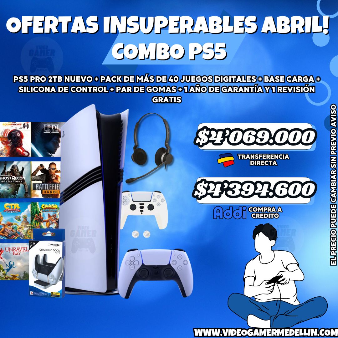 Consola PlayStation 5 Pro en paquete especial que incluye una colección de 40 títulos digitales predeterminados, acompañada de una base de carga, una silicona para el control y un par de gomas para los análogos; consola con un año de garantía, ofreciendo una experiencia completa de entretenimiento y rendimiento para los amantes de los videojuegos.