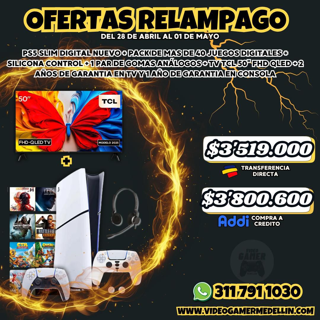 ¡Lleva el combo gamer perfecto para disfrutar al máximo! Consola PlayStation PS5 Slim Digital nueva de 825GB + TV TCL de 50” FHD QLED, una combinación ideal para vivir una experiencia de juego mucho más inmersiva, con excelente calidad de imagen, colores vibrantes y el rendimiento de nueva generación que solo la PS5 puede ofrecer. Además, incluye silicona protectora, par de gomas para joystick y pack de 40 juegos digitales en cuenta primaria o secundaria según disponibilidad para que empieces a jugar desde el primer día. El TV cuenta con 2 años de garantía y la consola con 1 año de garantía, brindándote total seguridad en tu compra.